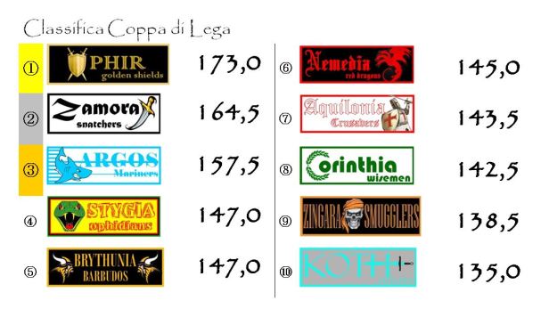 Per quanto riguarda la la Classifica di Coppa di Lega rimangono in testa i Golden shields a +8,5 su Zamora e +15,5 su Argos: