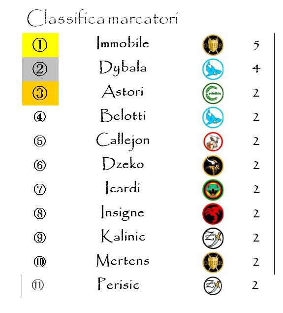 Infine chiudiamo con la classifica marcatori guidata ancora da un superbo Ciro Immobile immediatamente tallonato da Dybala.