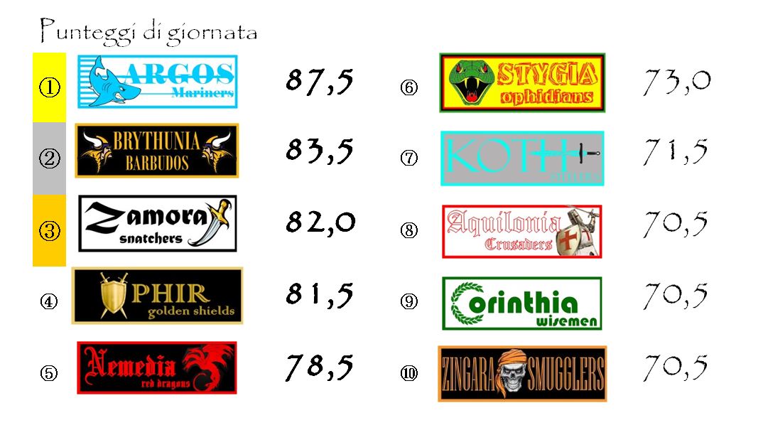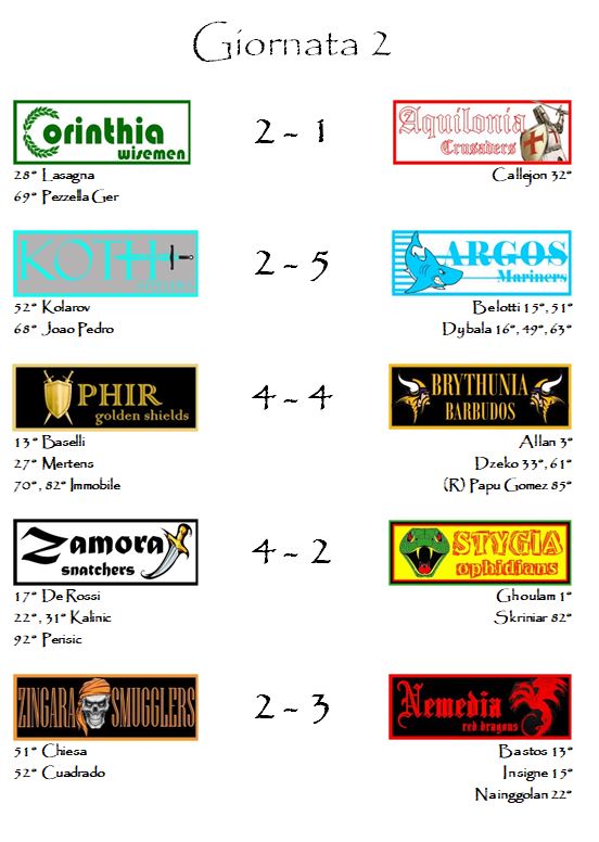 La favorita Ophir inciampa nella super giornata di Brythunia e riesce a salvarsi solo grazie alla doppietta di Immobile nel posticipo. Continua, come già accennato, la corsa di Nemedia che si impone in trasferta su Zingara. Continua anche quella di Zamora, una delle franchigie più convincenti di questo avvio di stagione. Gli Snatchers si aggiudicano il big-match della giornata contro Stygia e rimangono a punteggio pieno. Riparte con vigore il campionato di Argos che si riprende dalla batosta prima giornata infliggendone una uguale e contraria agli Steelers. Chiudono Corinthia e Aquilonia che fanno entrambe 70,5 ma non ci regalano il secondo pareggio di giornata perché il fattore campo arride ai Wiseman che riescono ad imporsi per 2-1 e ad aggiudicarsi l’intera posta in palio.