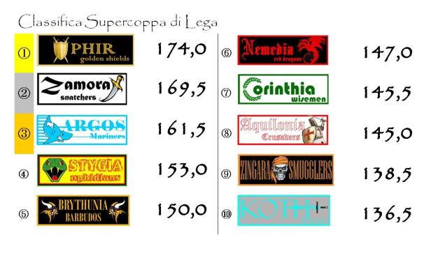 Quasi identica la situazione in Supercoppa dove per il momento solo Aquilonia e Corinthia si scambiano settima e ottava posizione (questione di bonus).