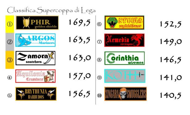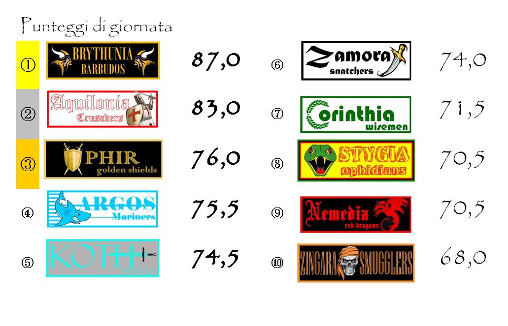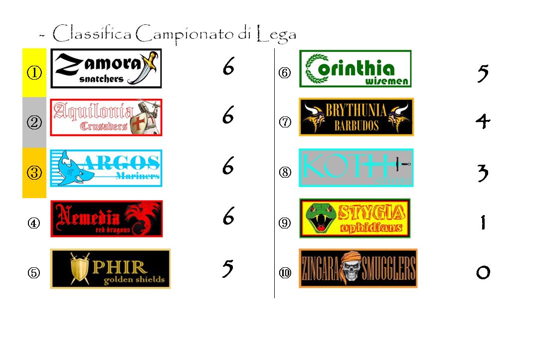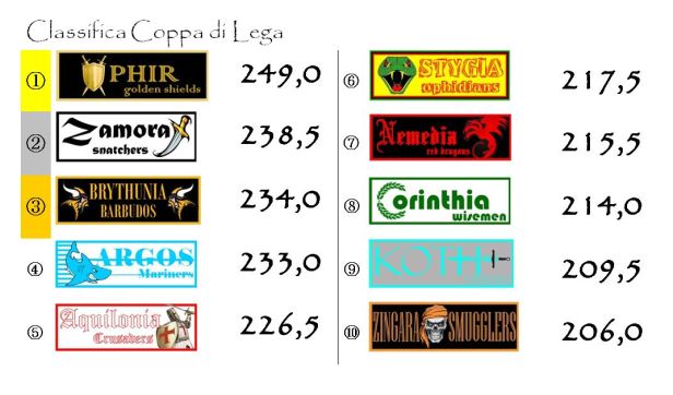 In Coppa balzo in avanti di Brythunia che soffia il terzo posto ad Argos. I gialloneri ora sono in scia di Zamora e minacciano di puntare anche al secondo posto. A metà del guado Aquilonia. Cominciano ad accusare invece un discreto distacco (più di 20, o addirittura di 30 punti nel caso di Zingara) tutte le altre franchigie.