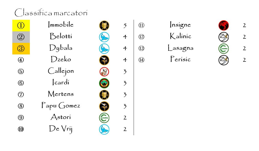 Infine veniamo alla classifica dei marcatori. Dietro a Ciro Immobile, a digiuno questa settimana, abbiamo un terzetto composto da Dybala, Belotti e Dzeko. Il Gallo di Argos per il secondo turno consecutivo usufruisce di un gol extra grazie all’ottimo punteggio della sua franchigia. Gli altri 5 gol extra di giornata vanno in ben 4 casi a dei difensori che hanno ottenuto ottimi voti. Anche questa settimana infatti i bonus difesa non sono mancati. Una marcatura a testa sul taccuino dunque per Masiello della Zamora, Regini della Stygia, Silvestre dell’Aquilonia e Acerbi della Koth. Gol extra anche per Marek Hamsik grazie al 68 fatto registrare da Zingara pur senza nessun +3 all’attivo.
