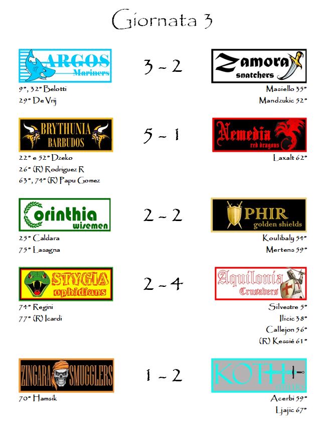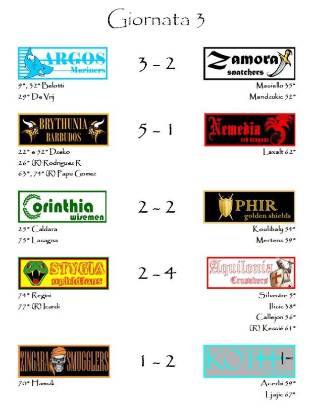 Questa prima frenata è fatale però per gli Snatchers sconfitti nel match clou della terza giornata in casa di Argos. Un solo punto e mezzo di differenza vale la prima sconfitta stagionale. I Mariners dal canto loro, grazie a questo 3-2, affiancano in vetta i sia gli stessi bianconeri che la Nemedia, uscita con le ossa rotte dalla trasferta in terra di Brythunia. I gol di Edin Dzeko e del Papu Gomez non hanno lasciato scampo ai Red Dragons. Per i rossoneri, inoltre, è arrivata la doppia tegola degli infortuni di Basta e Bastos. Nella prossima partita i Red Dragons si troveranno con ben 5 difensori in infermeria sui 10 disponibili in rosa.