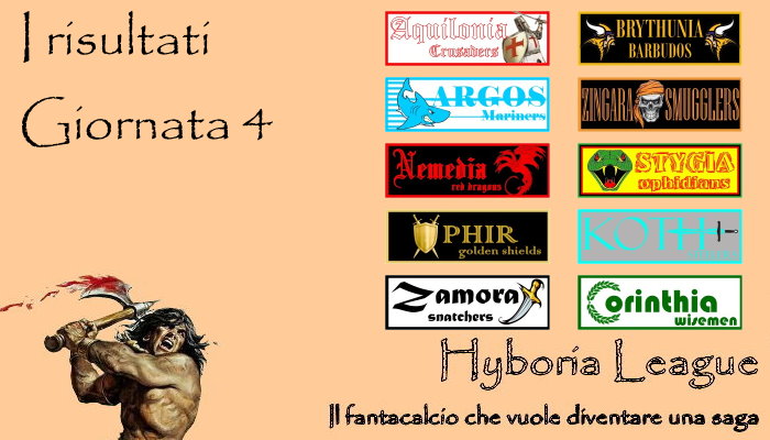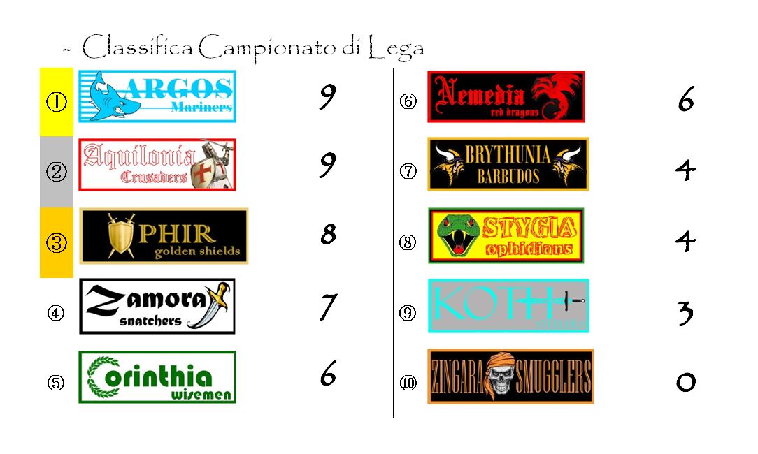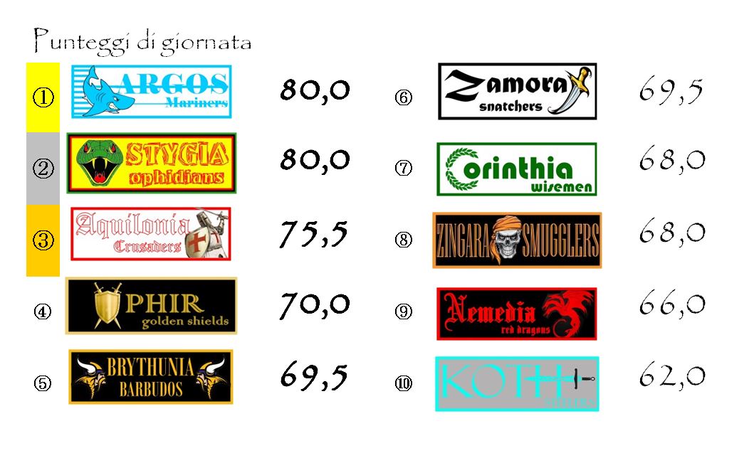 La prossima giornata ci proporrà la super sfida tra Aquilonia ed Ophir. L’altra capolista Argos farà visita alla Stygia in un altro match ad alta tensione. Completeranno il quadro Koth-Zamora, Corinthia-Nemedia e Zingara-Brythunia. Rimanete sintonizzati.