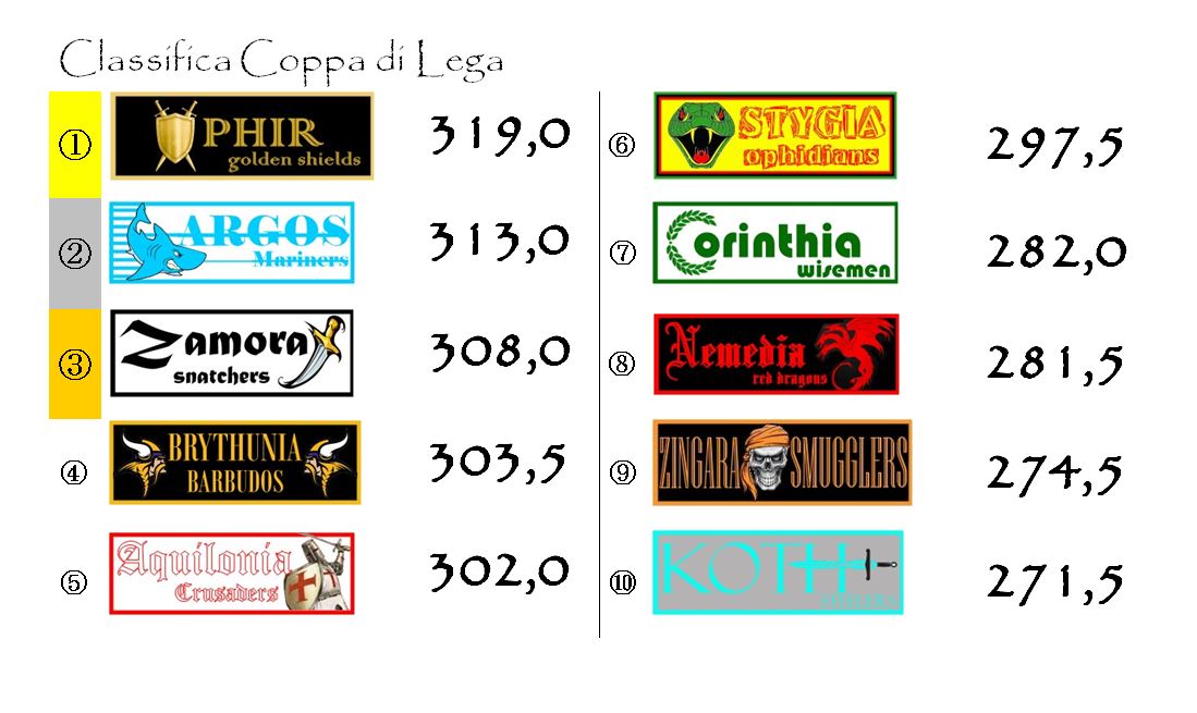 In Coppa continua la risalita degli Argos Mariners che sorpassano Zamora e Brythunia e ora puntano dritti alla vetta. Abbastanza stabili le altre posizioni con un gruppetto di quattro squadre (Nemedia, Corinthia, Zingara e Koth) che inizia ad accusare un distacco importante rispetto alle posizioni che contano.