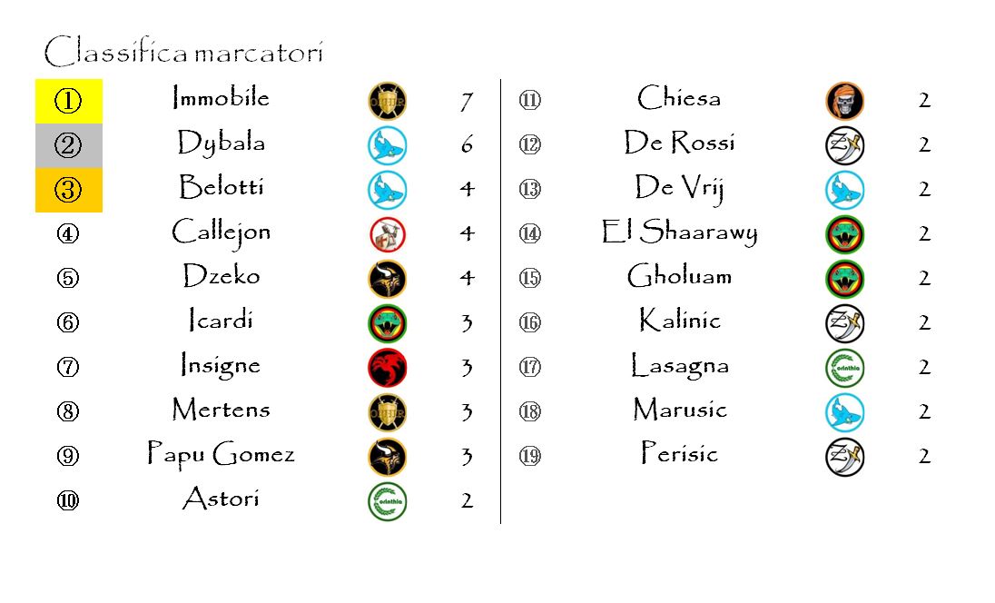 Inutile sottolineare come grazie alle doppiette di questa domenica Ciro Immobile e Paulo Dybala riescano a staccarsi dal gruppone e ad accennare una mini-fuga verso il Pugnale d’oro di Hyboria. Tre i gol extra attribuiti in questa giornata: uno a Lulic, uno a Marusic ed uno a De Rossi. A fargli da contraltare i tre gol persi a causa dei punteggi insufficienti: quelli di Dzeko, Duvan Zapata e Alex Sandro.