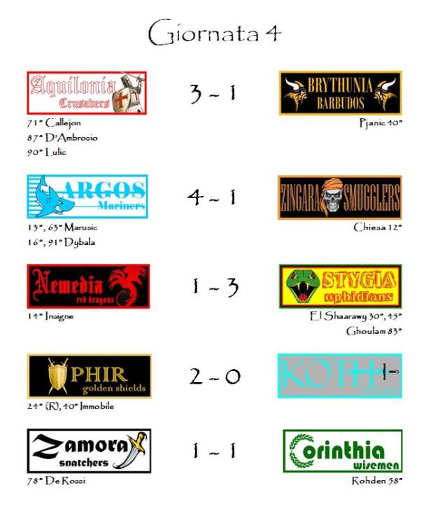 Ben tre le vittorie casalinghe in Campionato. Le tre protagoniste di queste vittorie grazie ad esse si ritagliano un posto in vetta della classifica provvisoria. Vince Argos che strapazza per 4-1 Zingara nel primo derby della storia dell’Hyboria League (l’altro tra Aquilonia e Nemedia è in calendario all’ottava giornata). Si tratta della terza vittoria consecutiva per i Mariners. Per gli Smugglers invece siamo alla quarta sconfitta in quattro partite. Un avvio catastrofico che si può solo parzialmente giustificare col basso rendimento dei top players Hamsik ed Higuain. Gli Argos dunque volano in testa a quota 9. A fargli compagnia Aquilonia che regola per 3-1 una Brythunia condannata dall’errore dal dischetto del Papu Gomez. Un altro errore dal dischetto, quello di Perotti, poteva costare carissimo ad Ophir, ma poi ci ha pensato il solito Ciro Immobile: i Golden Shields hanno sconfitto come da pronostico i Koth Steelers con un secco 2-0 riuscendo a mantenere così il passo delle prime.