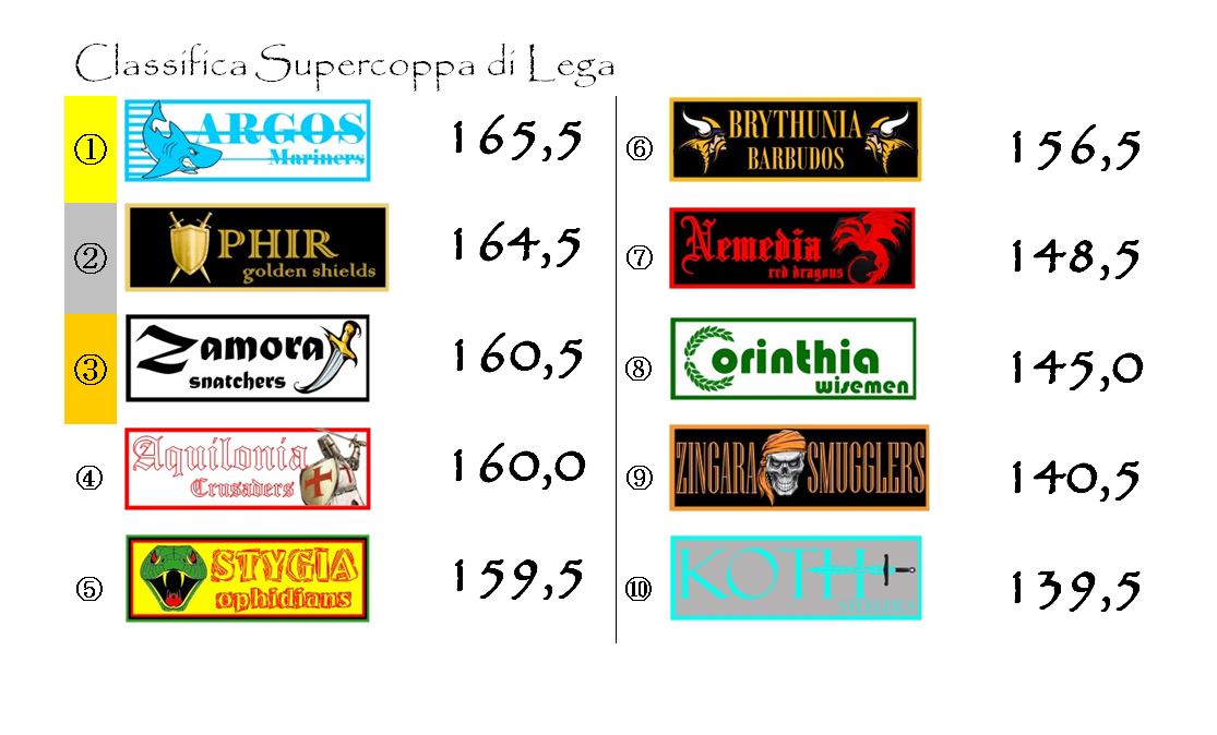 In Supercoppa invece l’operazione sorpasso si è già compiuta: Argos passa al comando approfittando del 70,0 settimanale di Ophir, punteggio più basso dell’anno per i Golden Shields. La franchigia dello scudo perde in un colpo solo ben 5 punti. La classifica rimane comunque cortissima con le prime sei sono racchiuse in soli 9 punti.