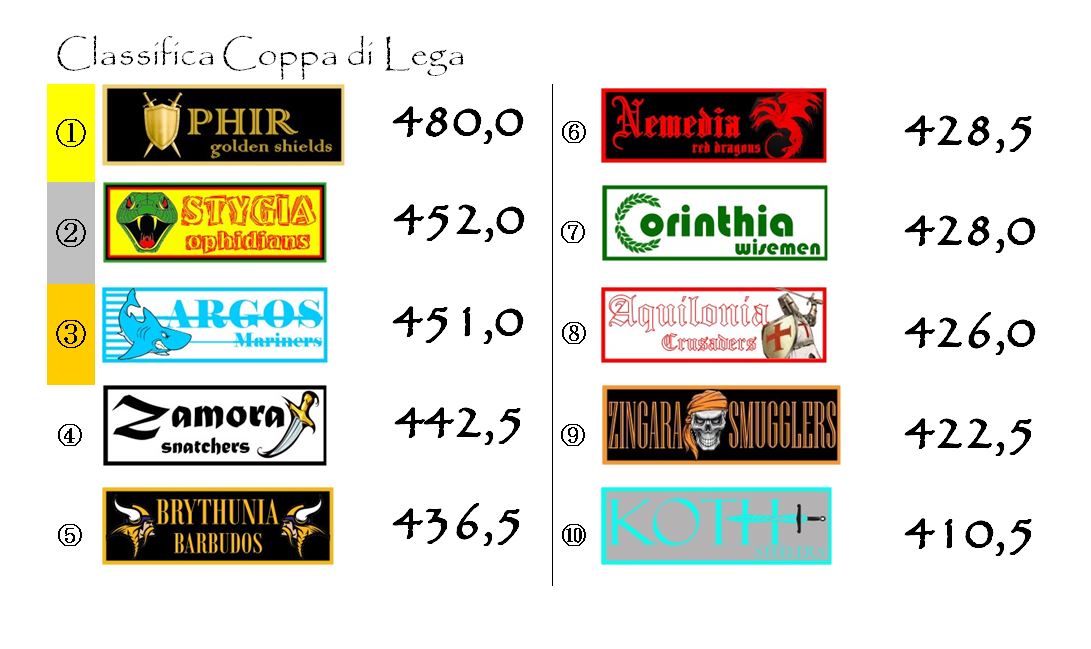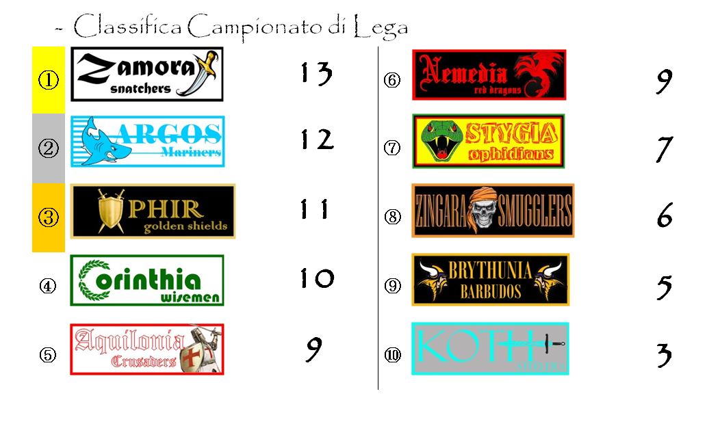 Al quarto posto in solitaria ora c’è l’unica franchigia imbattuta di tutta l’Hyboria League: Corinthia. Lo 0-0 contro Brythunia rappresenta per i Wisemen il quarto pareggio stagionale. Molto fortunati comunque i biancoverdi data la decisione della Figc di non attribuire il secondo gol del Milan a Jack Bonaventura. In caso contrario i Barbudos sarebbero riusciti a portarsi a casa l’intera posta in palio.