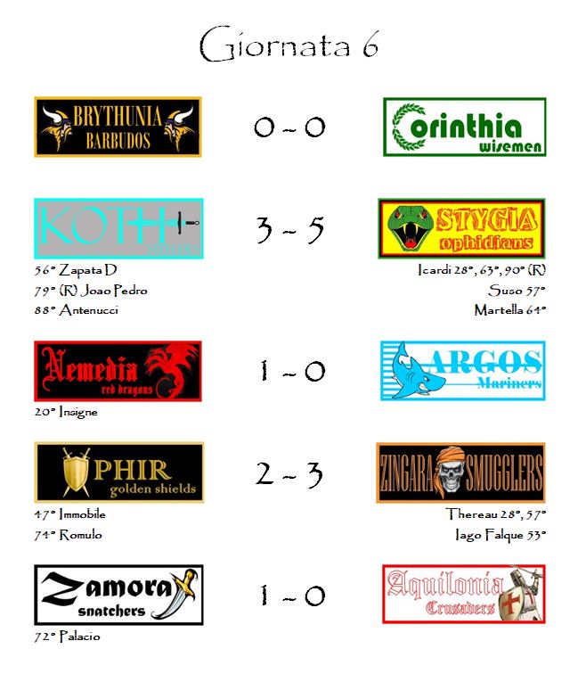 Se la quinta giornata sembrava aver scavato un solco netto tra le migliori e le peggiori franchigie del campionato, la sesta è arrivata puntualmente a smentire ogni ragionamento ed elucubrazione precedenti. Sono cadute infatti le prime due in classifica. Ophir, come abbiamo già accennato, ha perso per 3-2 in casa contro Zingara con i nero-arancio che, al secondo successo consecutivo, sembrano ormai rinati nonostante la perdurante crisi di Gonzalo Higuain. E’ caduta anche Argos, ma la sconfitta dei Mariners era più che preventivabile. L’1-0 rimediato contro la Nemedia ha tuttavia una buona componente di sfortuna: Dybala e il suo rigore sbagliato allo scadere contro la Lazio. In caso contrario i biancazzurri avrebbero tranquillamente pareggiato, se non addirittura rischiato di vincere, nonostante la rosa decimata dagli infortuni.