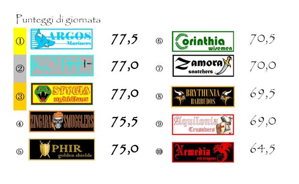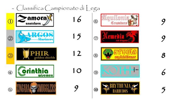 Ultimo match, ma non meno importante, quello tra i Crusaders e gli Steelers. Koth ha espugnato Tarantia con un perentorio 3-1 conseguendo la seconda vittoria in campionato (entrambe esterne) e abbandonando così l’ultimo posto in classifica, ora occupato dai Barbudos. Per i grigi stratosferica prestazione di squadra con ben 4 punti bonus, impresa che finora era riuscita solo agli Stygiani alla prima e alla sesta giornata. Una vittoria netta che sarebbe stata molto più rotonda se non avessimo commesso l’errore di lasciare Khedira in panchina. Per Aquilonia è la terza sconfitta consecutiva e già domani sarà “derby della delusione” contro gli acerrimi nemici di Nemedia.