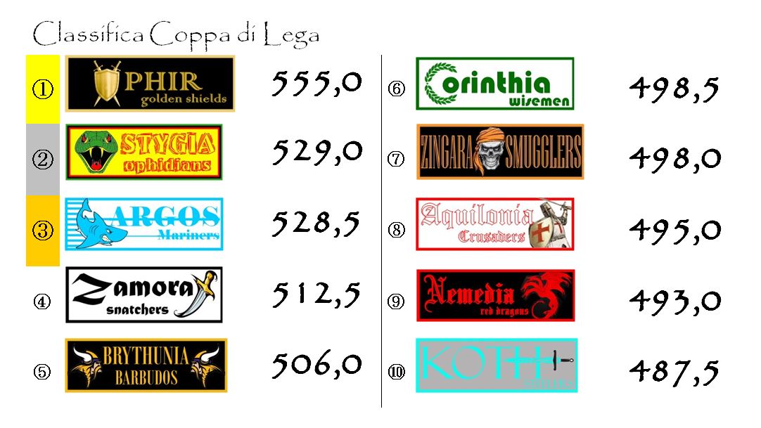 Non si è mosso molto in classifica in Coppa. Stygia e Argos hanno rosicchiato un paio di punti ad Ophir che però ha guadagnato terreno sul resto del gruppo. In coda ha ceduto qualche posizione Nemedia mentre Koth è riuscita a colmare buona parte del seppur non enorme gap che aveva nei confronti del gruppone.