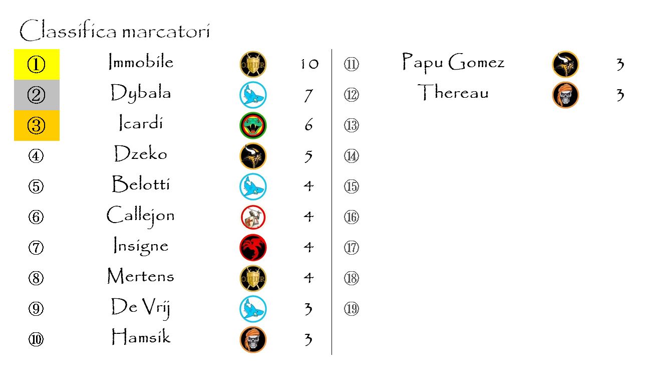 Chiudiamo con la Classifica marcatori e con lo scatto in avanti di Ciro Immobile che ha raggiunto la doppia cifra, primo giocatore in assoluto nella brevissima storia dell’Hyboria League. Dietro di lui solo Dybala è riuscito a fare un passettino in avanti. E’ stata attribuita a lui infatti una della marcature mancanti necessarie ad integrare il punteggio di Argos. Le marcature mancanti sono state le protagoniste in questa giornata di punteggi più alti dei bonus gol effettivamente conseguiti: ne hanno usufruito ben 9 giocatori (Acerbi, De Vrij, Dybala, Masiello, Suso, Romulo, Alex Sandro, Hamsik e Biraghi). Record che dimostra ulteriormente come i bonus questa settimana siano arrivati in buona parte da componenti diverse dai gol stessi. Senza rispiegarvi qui i criteri con i quali vengono assegnate le marcature mancanti vi rimando alla sezione apposita del regolamento: 0.7 – Il Titolo di Capocannoniere.