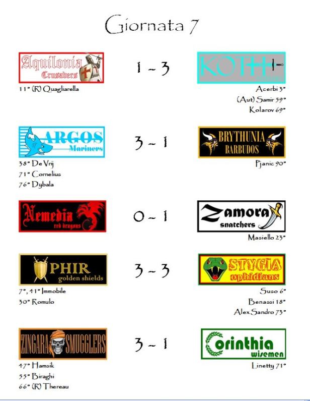 Difese e portieri sugli scudi in questo settimo turno di Hyboria League che non è riuscito a regalarci punteggi mirabolanti ma che sicuramente ha vissuto di equilibri e colpi di scena fino alla fine dell’ultimo posticipo. La vittoria se l’è aggiudicata sul filo di lana Argos con 77,5 punti, solo mezzo in più rispetto a Stygia e Koth. Poco dietro anche Zingara e Ophir.