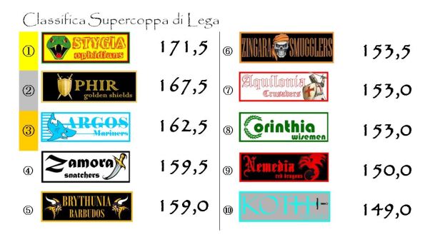 In Supercoppa invece è ancora Stygia a farla da padrona. Per gli Ophidians altri 3 preziosi punti bonus quest’oggi e primato che si consolida. Nelle retrovie bella rimonta di Koth che in un sol colpo ha guadagnato 6 punti portandosi praticamente a ridosso di una Nemedia in discesa di mezzo punto.