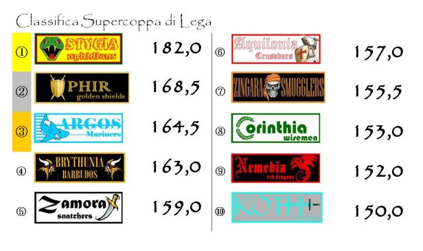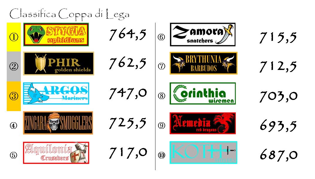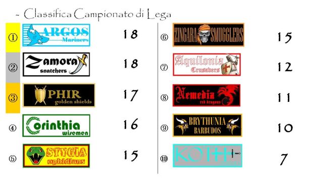 Balzo in avanti in Coppa per Zingara e Aquilonia che guadagnano due posizioni ciascuna a discapito di Zamora e Brythunia. Per il resto nessun cambiamento rilevante a parte la prima posizione solitaria degli Ophidians che staccano di due punti i Golden Shields.