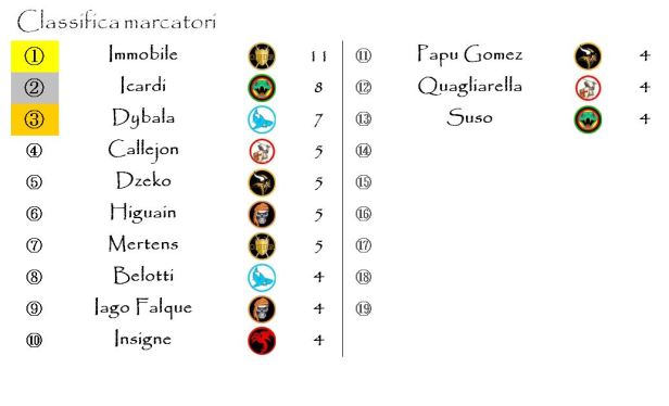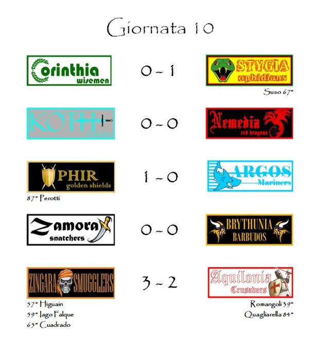 L’oscar della sfiga se lo aggiudicano i Crusaders che pur mettendo a segno il secondo miglior punteggio di giornata sono incappati, da calendario, nell’unico incrocio dal quale sarebbero potuti uscire sconfitti, ovvero quello con gli Smugglers. A Kordava è finita 3-2 per Zingara grazie ad Higuain, Cuadrado e Iago Falque. Inutili per Aquilonia le reti di Quagliarella e Romagnoli.