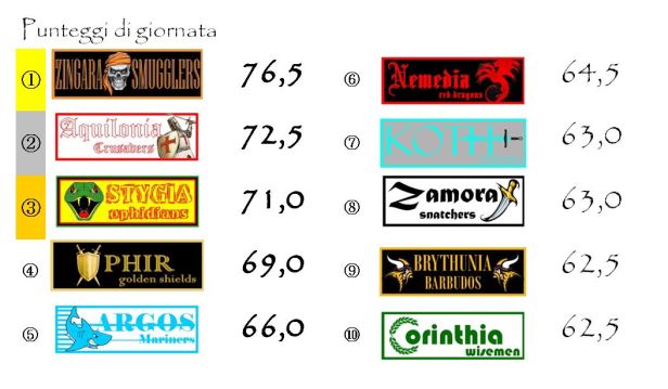 Sono stati gli Zingara Smugglers ad aggiudicarsi la vittoria di giornata con 76,5 punti. Le uniche altre due franchigie a superare quota 70 sono state Aquilonia e Stygia con ripercussioni ovvie in Campionato dove si sono registrati ben due pareggi a reti inviolate (è la prima volta che accade) e due vittorie con “Li nummeri” di Trilussa.