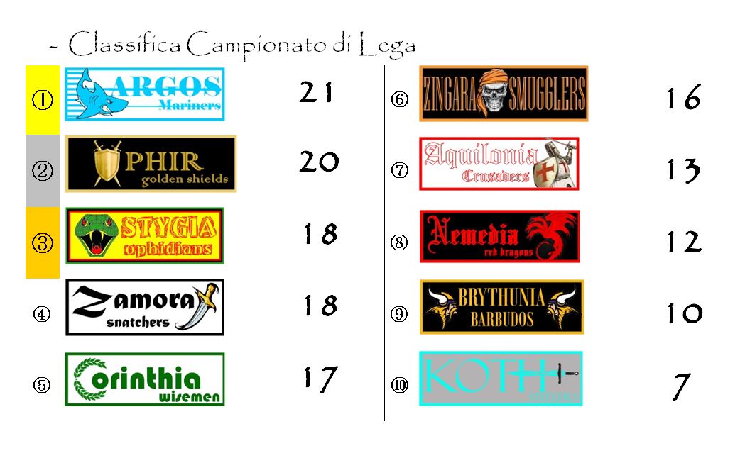 Il prossimo turno non sarà dei più banali. Quattro delle prime cinque franchigie si affronteranno in scontri diretti importantissimi: oltre al già citato Zamora-Argos il calendario infatti ci offrirà anche un succoso Ophir-Corinthia con i Golden Shields che appaiono nettamente favoriti, ma chi può dirlo con certezza? L’Hyboria league è per sua natura molto imprevedibile. All’andata l’ormai ex-cenerentola fermò la corazzata dell scudo sul 2-2. E vederle oggi separate di soli tre punti dopo le rispettive lodi e condoglianze post-sorteggio deve far riflettere.