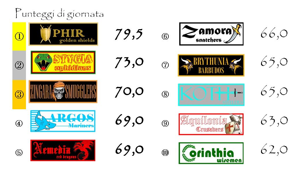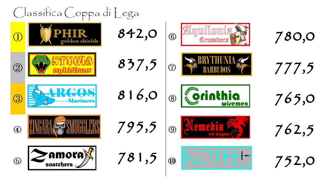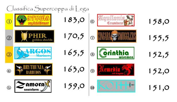 Non accade quasi nulla in Supercoppa visti i punteggi “banali” e i pochi bonus di squadra conquistati in questa undicesima giornata. L’unica franchigia a portare a casa due punti è stata Ophir. Per il resto un punto ciascuno a Stygia, Argos, Aquilonia e Koth. Niente per tutte le altre. Corinthia ha fatto registrare il suo peggior punteggio della stagione e di conseguenza ha perso mezzo punto.