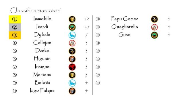 Chiudiamo con la classifica dei marcatori: Ciro Immobile ha incrementato il suo bottino personale e viaggia ora a quota 12. A lui si avvicina minacciosamente Mauro Icardi che con la doppietta di ieri è salito a quota 10. Nelle retrovie ha mosso la classifica solo Lorenzo Insigne, mentre sia Higuain che Dybala si sono visti privare del proprio gol a causa dei punteggi troppo bassi fatti registrare dalle rispettive franchigie. Oltre agli attaccanti della Juventus, questa settimana, non assegnati per il medesimo motivo anche i gol di Caceres e Nainggolan. Nessun gol extra a far da contraltare.