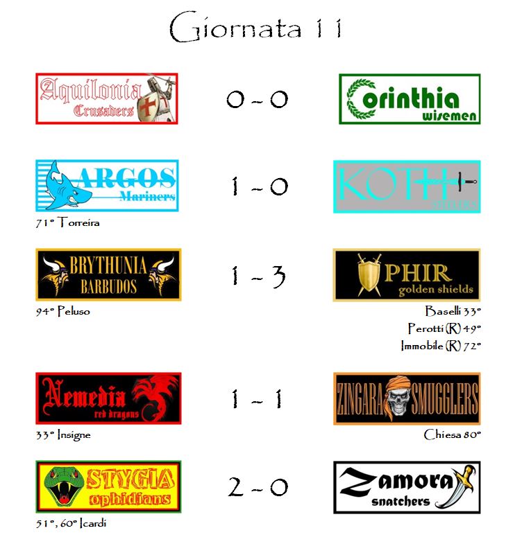 Terze a pari merito ora troviamo Stygia e Zamora che si affrontavano a Khemi nel match di cartello di questa undicesima giornata. Gli Ophidians si sono imposti con un netto 2-0. Provvidenziale la doppietta di capitan Icardi a fronte di una prestazione di squadra non molto entusiasmante. La crisi di Zamora (due pareggi e due sconfitte nelle ultime quattro giornate) comincia ad assumere un carattere cronico. Neanche l’innesto di Ciciretti è riuscito a dare la scossa. I bianconeri devono provare ad uscire dal tunnel perché domenica riceveranno in casa la capolista Argos in una partita che appare uno scontro decisivo. Un’altra sconfitta potrebbe significare un netto ridimensionamento delle ambizioni in Campionato, l’unica delle tre competizioni nelle quali la franchigia può vantarne ancora, almeno per ora.