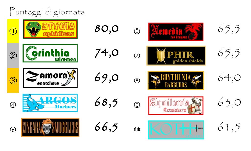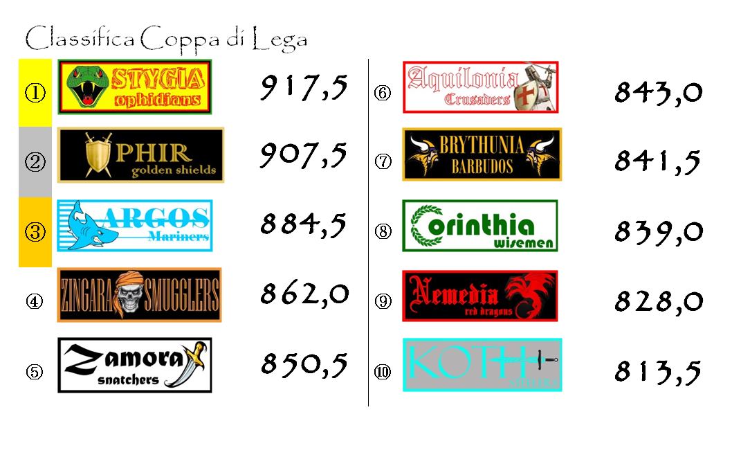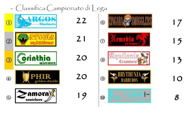 In Coppa, come anticipato nell’introduzione, è saltato di nuovo il banco in testa. Contro sorpasso al contro sorpasso della settimana scorsa e Stygia ora al comando con 10 lunghezze tonde tonde di vantaggio su Ophir. Il resto delle posizioni è rimasto invariato con i Mariners e gli Smugglers che hanno perso terreno rispetto alla prima posizione e Corinthia che si è portata a ridosso di Brythunia e Aquilonia, senza però riuscire ad agganciarle. Sempre più a fondo Koth, ormai a oltre 100 punti dalla Stygia.