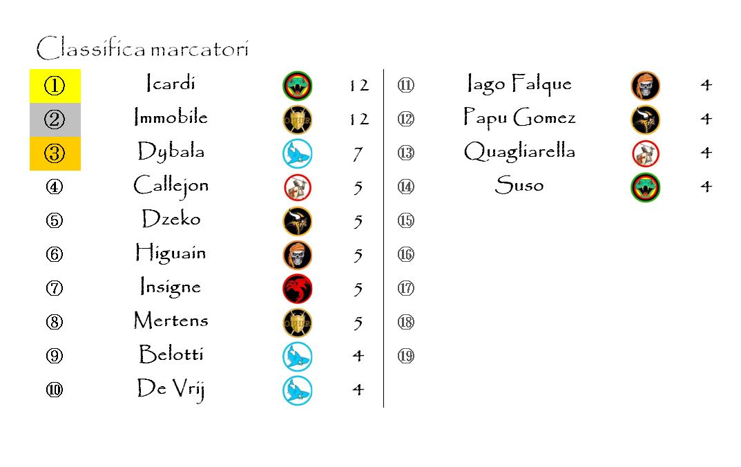 Come anticipato nell’introduzione nella classifica dei marcatori Mauro Icardi ha raggiunto a quota 12 Ciro Immobile che era stato al comando in solitudine sin dalla prima giornata. Alle spalle dei due leaders non si è mosso niente. Unica novità il bomber che non ti aspetti, Stefan de Vrij, che grazie alla sua quarta marcatura stagionale si è inserito nei migliori quattordici.