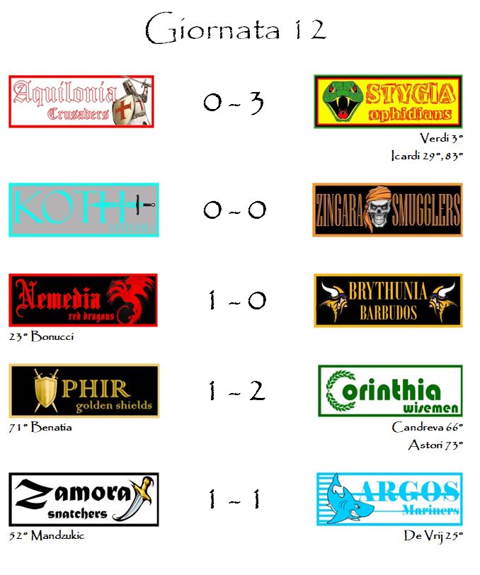 Non ci perderemo d’animo manco questa volta anche perché la tredicesima non sarà una giornata come tutte le altre. A prescindere da questioni di classifica la partitissima sarà quella di Kordava tra le acerrime rivali Zingara e Argos. All’andata fu 4-1 per i Mariners ma per gli Smugglers fu come interrompere un incantesimo malefico. Hamsik e compagni infatti da quella partita (erano ultimi in classifica a zero punti dopo quattro giornate) hanno iniziato ad inanellare una vittoria dopo l’altra perdendo solo con la Stygia e mettendo insieme ben 17 punti in otto gare. Se il campionato fosse partito alla quinta giornata sarebbero primi proprio insieme agli Ophidians e per distacco.