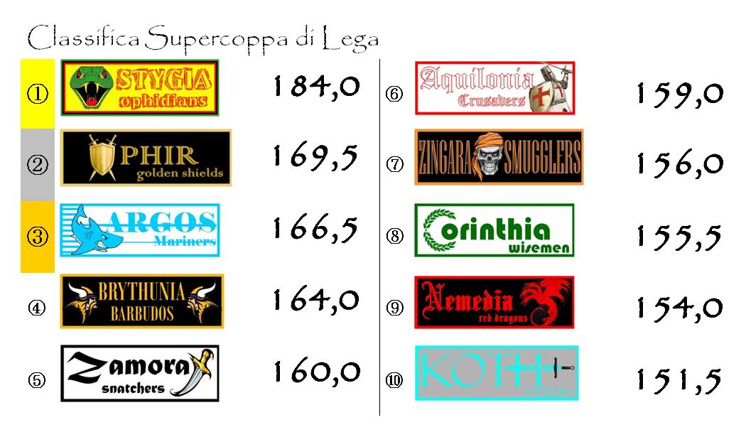 Statica la situazione in Supercoppa dove si sono mossi praticamente tutti i punteggi ma le posizioni sono rimaste invariate. Tutte le franchigie sono andate a bonus con Corinthia che ha fatto meglio di tutti portando a casa per la prima volta nella stagione 3 punti. E’ andata male Ophir che ha fatto registrare il suo punteggio minimo stagionale e che nel complesso ha ceduto un punto. Altri due minimi stagionali li hanno fatti registrare Koth e Zingara che però, controbilanciando coi bonus, hanno aumentato il loro computo complessivo di mezzo punto ciascuna.