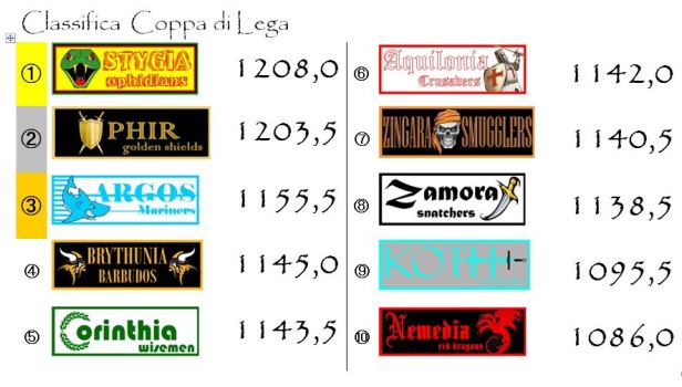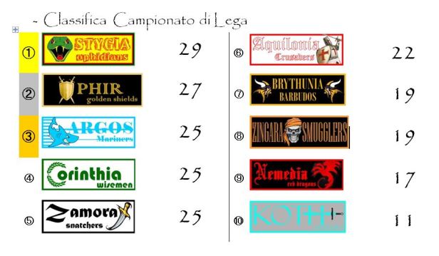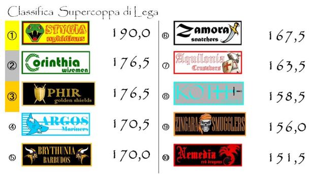 In Supercoppa di Lega non si muove molto. La Stygia è sempre saldamente al comando, anche se non riesce più ad imporre il ritmo forsennato di qualche mese fa. Corinthia ha appaiato al secondo posto Ophir. Nelle retrovie continua invece la lenta risalita di Koth che, a dispetto della posizione in classifica, si sta rivelando una franchigia capace di mettere in cassaforte una buona media bonus.