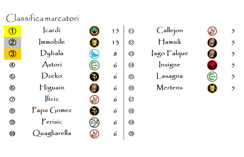 Nella classifica dei marcatori si rivede Ciro Immobile. Il centravanti di Ophir ha vinto la sfida diretta contro il rivale Icardi ed è riuscito ad accorciare la distanza. Ora i due bomber sono divisi da sole due reti. Salgono anche Astori, Ilicic, Papu Gomez, Hamsik, Iago Falque e Lasagna.