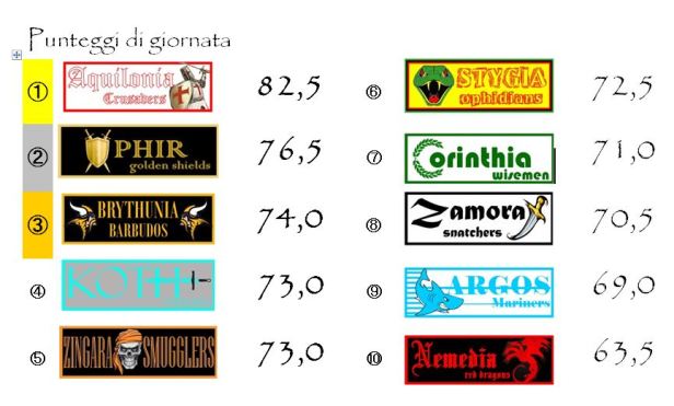 Un’Argos, sempre più in crisi, è andata a perdere sul campo dei Brythunia Barbudos. I Mariners, con Duoglas Costa e Dybala non impiegati neanche un minuto allo Stadium, si sono trovati a giocare con un 5-4-1 che gli ha portato la miseria di 69 punti. Unico +3 all’attivo quello di Widmer. I padroni di casa, trascinati dal +3 di Allan e da tanti buoni voti (quello del Papu Gomez su tutti), sono arrivati a 74 e si sono imposti con un 2-1 che avrebbe potuto essere ancor più rotondo.