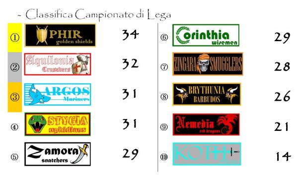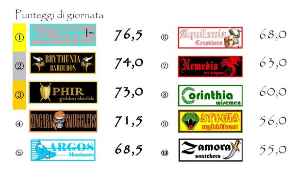 La terza piazza se l’è ripresa Argos, nonostante la prestazione non positiva di questa giornata. Alle sue spalle, ad un’incollatura, Aquilonia. Corinthia e Brythunia (quest’ultima ha recuperato una buona manciata di punti su tutte tre le franchigie che la precedono) sono staccate di meno di dieci lunghezze. Per il podio sarà lotta serratissima e vedremo ancora numerosi avvicendamenti da qui alla fine della stagione.