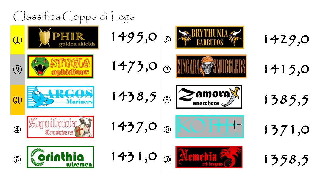 I risultati di alcune franchigie, soprattutto quelli negativi, hanno provocato subbuglio anche nella classifica di Coppa. Stygia ha incassato un duro colpo lasciando sul campo ben 18 lunghezze in una sola giornata ai rivali di Ophir. Mai nella storia recente di questa stagione gli Ophidians si erano trovati così indietro rispetto alla franchigia dello scudo. Il distacco non è incolmabile ma se Icardi non ricomincerà a segnare sarà dura recuperare.