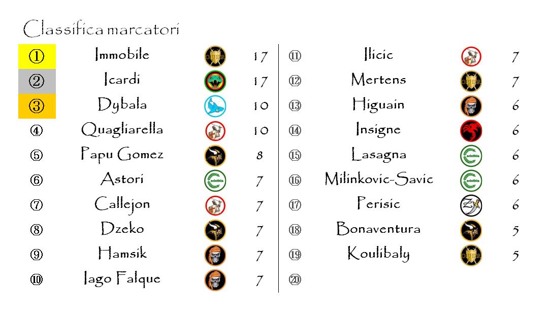 Assenti per infortunio Immobile, Dybala e Quagliarella e con Icardi a secco, gli unici movimenti nella zona alta della classifica marcatori si sono avuti alle spalle della zona podio. Dries Mertens con la sua doppietta ha risalito alcune posizioni così come hanno fatto Iago Falque ed Ilicic. Lo sloveno ha beneficiato della marcatura extra che ha permesso ad Aquilonia di espugnare il campo dei Wisemen. Ha fatto il suo ingresso nella top 20 anche Jack Bonaventura che con la rete di ieri è salito a quota 5.