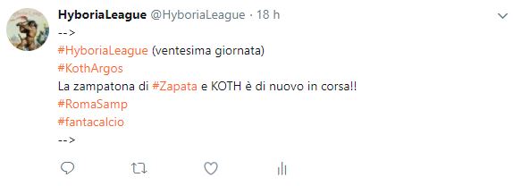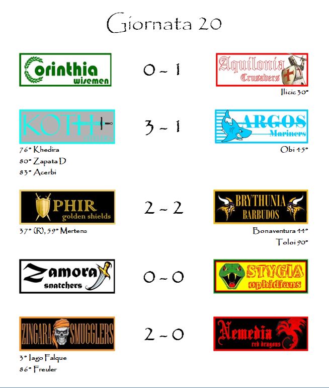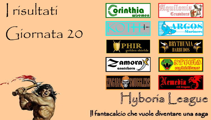 Se avessimo dovuto scegliere un titolo fuori da quello canonico per presentarvi i risultati di questo ventesimo turno di campionato non ci sarebbe rimasto che utilizzare un adattamento dell’ultimo twit del live “Tutta l’Hyboria League minuto per minuto” pubblicato ieri sera durante il posticipo Roma-Sampdoria.
