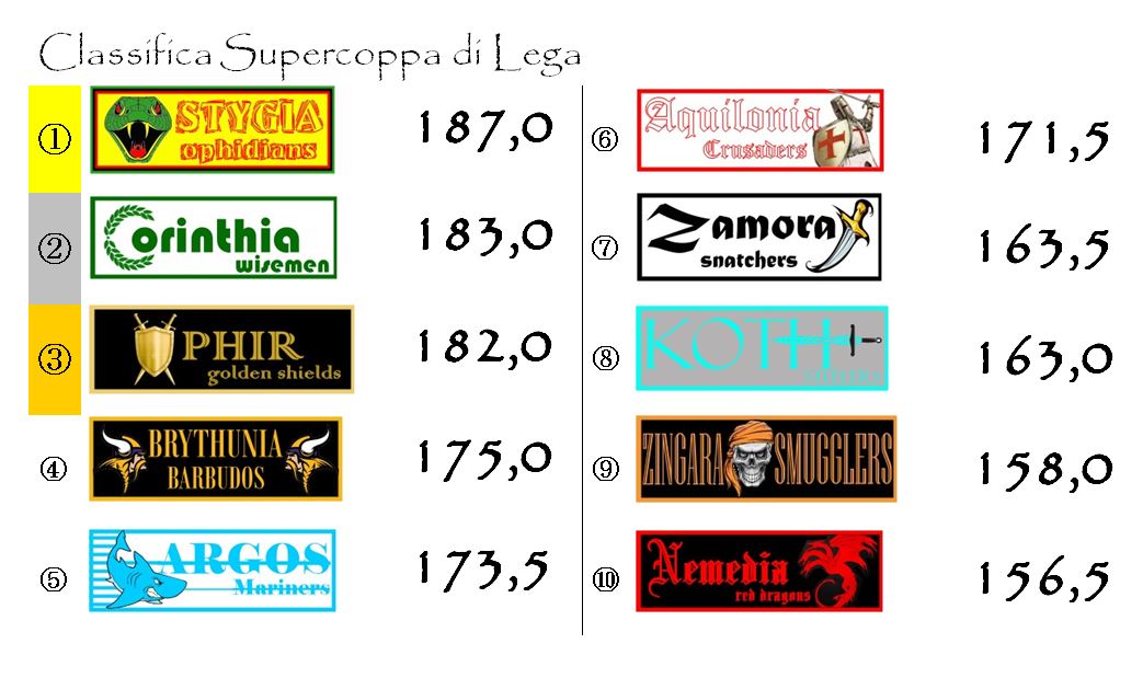 Nessun cambio di posizione in Supercoppa ma situazione che è drasticamente mutata in cima alla classifica: Stygia ha dilapidato 8 punti, Corinthia ne ha buttato via uno, ed ecco allora che Ophir (+2) si è riportata sotto. Il discorso è completamente riaperto con tre franchigie raccolte in soli 5 punti (che è il massimale bonus di una sola giornata). Potremmo vederne delle belle da qui a fine stagione.