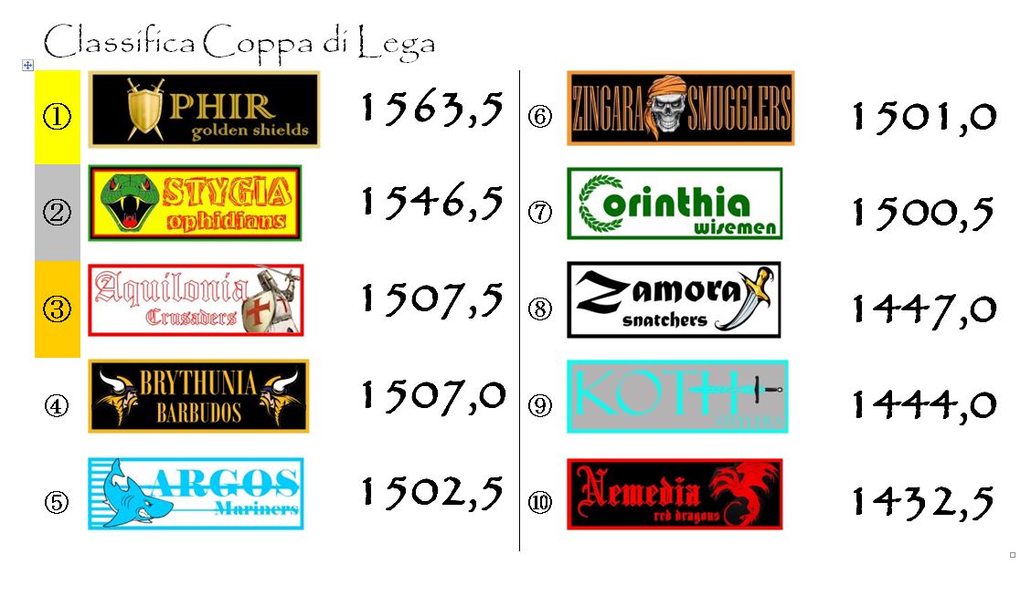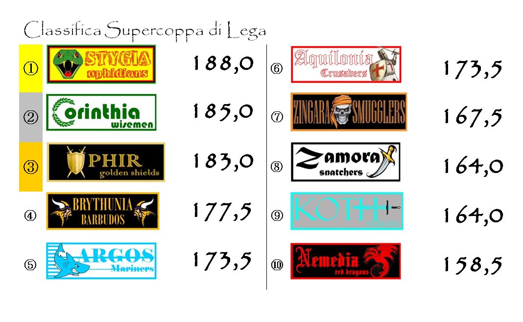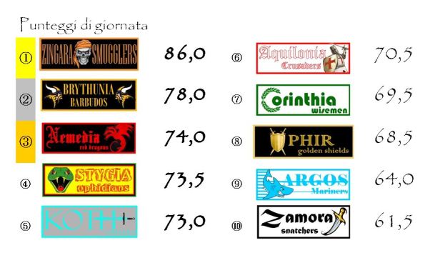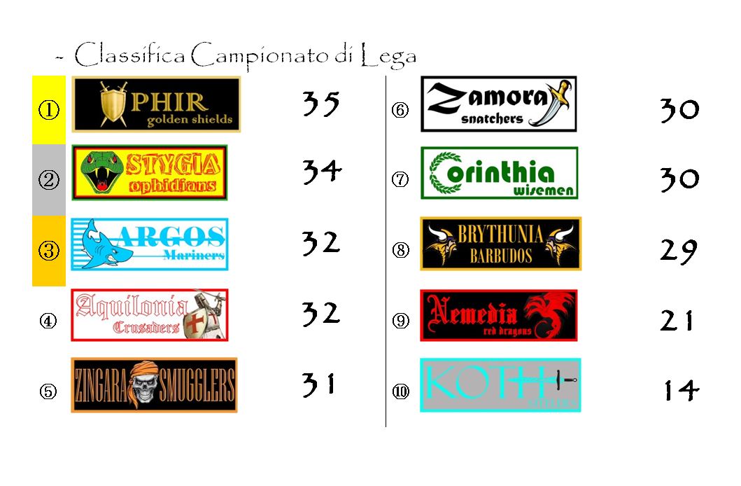 In testa rimane sempre Ophir, con Stygia che è riuscita a rosicchiare qualcosina, ma non troppo. In coda sono sempre più evidenti le difficoltà di una Zamora ormai quasi raggiunta da Koth e che vede avvicinarsi anche la Nemedia. Più per demeriti propri, che per meriti degli avversari.
