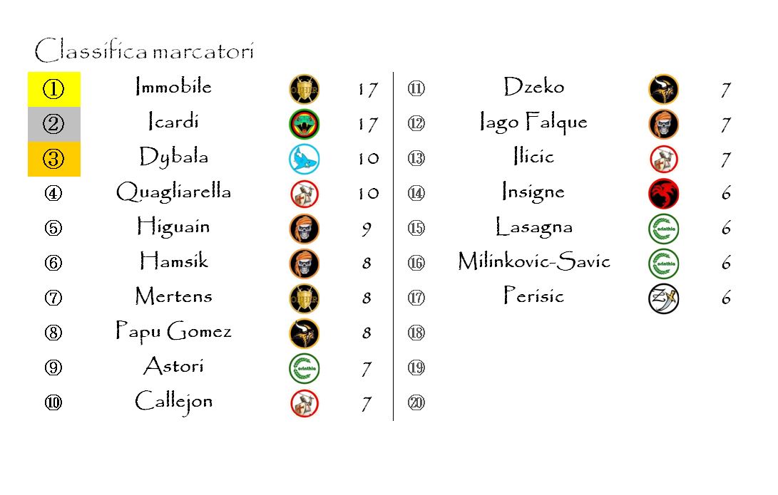 Nella classifica dei marcatori è rimasto fermo al palo Immobile (scusate il gioco di significati), incapace di approfittare del turno di stop di Mauro Icardi. Continuano invece i movimenti nelle posizioni di rincalzo. Questa settimana è toccato a Gonzalo Higuain fare un sostanzioso balzo in avanti. Il Pipita, grazie alla sua tripletta, ha scavalcato una decina di concorrenti. Hanno guadagnato qualche posizione anche Marek Hamsik e Dries Mertens.