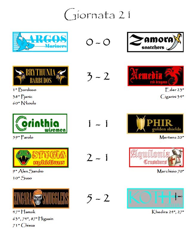 Rimarrà indelebile su questa ventunesima giornata la firma di Gonzalo Higuain. Il Pipita, con la sua prima tripletta in bianconero, ha consentito agli Zingara Smugglers di mettere a segno il proprio miglior punteggio stagionale (aggiudicandosi la seconda “V” dell’anno) e di scalare diverse posizioni in ognuna delle tre competizioni dell’Hyboria League.