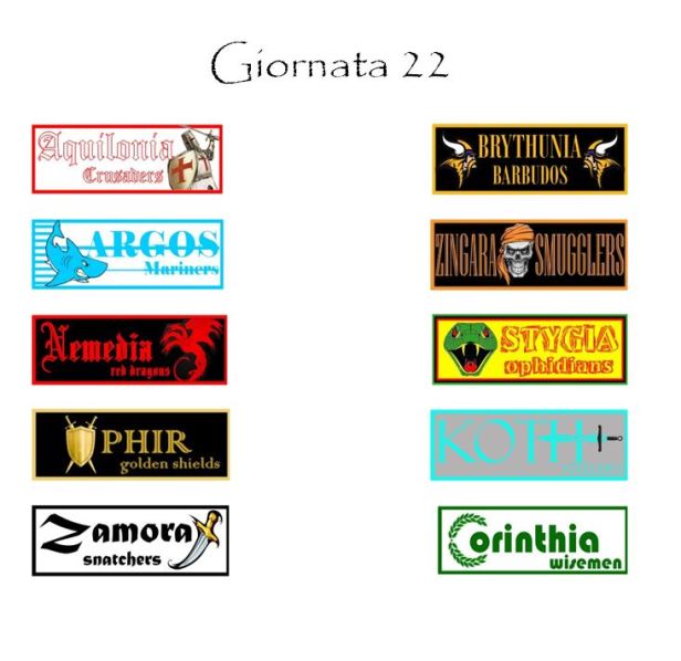 Interlocutorio il programma della ventiduesima giornata di Campionato. Le prime due della classe, Ophir e Stygia, affronteranno rispettivamente le ultime due della classe, Koth e Nemedia. Si tratta di incontri sulla carta apparentemente agevoli visti anche i precedenti. Sia Ophir che Stygia, infatti, hanno fatto sempre bottino pieno, sia alla quarta giornata che alla tredicesima. Rimaniamo comunque dell’avviso che non si debba dare nulla per scontato per scontato in Hyboria League e nel fantacalcio in generale.