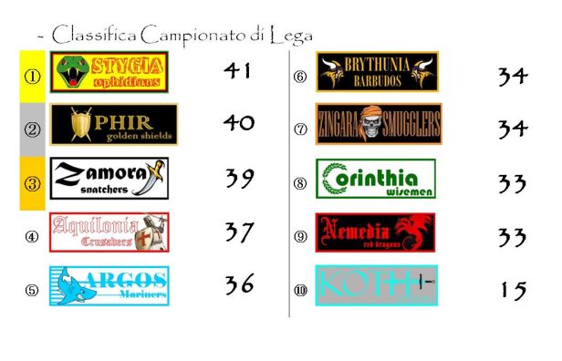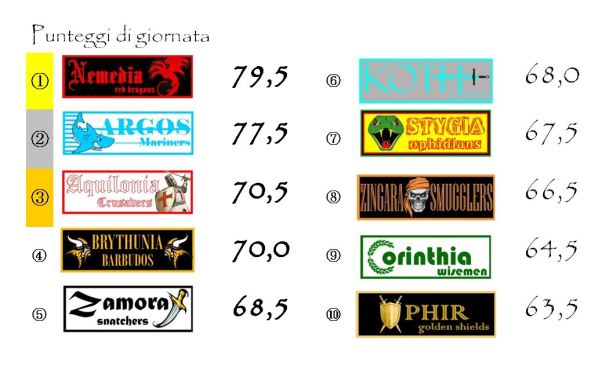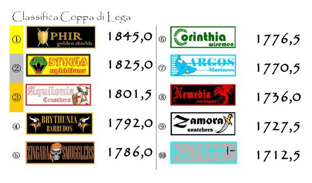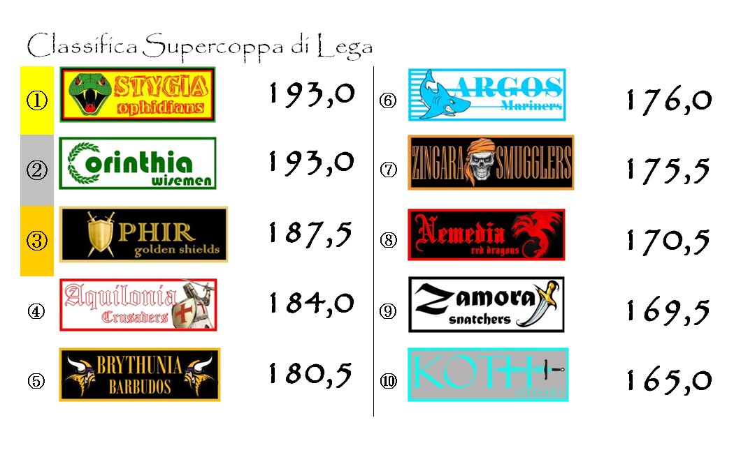 Lo stesso discorso vale anche per la Supercoppa: l’unico sorpasso di giornata è stato proprio quello di Nemedia (tre punti bonus e miglior prestazione stagionale) ai danni di Zamora. In testa continuano appaiate Stygia e Corinthia che in questo turno hanno collezionato però la miseria di un solo bonus a testa. E’ riuscita a far ancora peggio Ophir che ha perso mezzo punto e ora vede avvicinarsi pericolosamente alle sue spalle gli Aquilonia Crusaders.