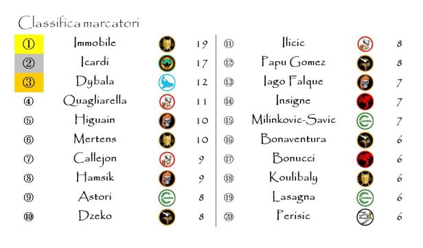 Nessun allungo in classifica marcatori per Ciro Immobile che si è visto negare la gioia della ventesima marcatura stagionale nonostante la prodezza di Cagliari. Insufficiente infatti il punteggio di Ophir che, come spiegato già in precedenza, per vari motivi, non è riuscita a centrare la soglia gol. E’ risalito al terzo posto, scavalcando Fabio Quagliarella, Paulo Dybala, autore di una doppietta. Nelle retovie hanno mosso la graduatoria Ilicic e Bonucci (primo ingresso nella Top 20 per il capitano di Nemedia), beneficiari di due marcature extra.