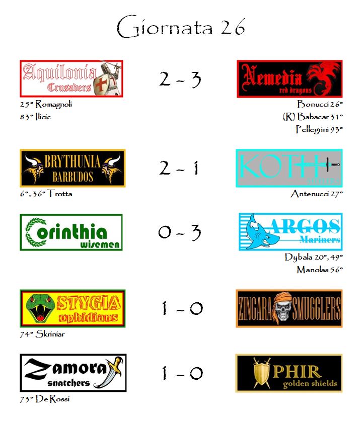 Due sole le insufficienze tra le fila dei Dragoni (Basta e Insigne). Le reti di Babacar, primo giocatore nella storia dell’Hyboria League a segnare con la maglia di due franchigie diverse (fino a gennaio il senegalese aveva militato nei Koth Steelers), e del subentrante Pellegrini, unite agli assist di Nainggolan e ai tre punti bonus di squadra, hanno consentito a Nemedia di espugnare Tarantia, nonostante la strenua resistenza dei padroni di casa. Aquilonia infatti, pur non avendo collezionato alcun +3, è riuscita ugualmente a superare quota 70, marcando per ben due volte. Ottima prestazione anche per i Crociati che, con due punti bonus di squadra e due assist (Ilicic e Felipe Anderson), hanno fatto comunque registrare il terzo miglior punteggio assoluto di questa ventiseiesima giornata.