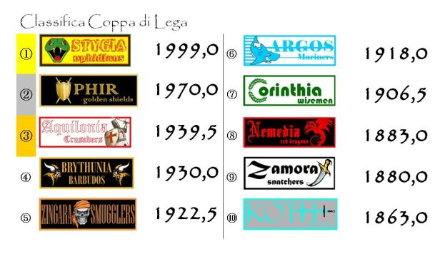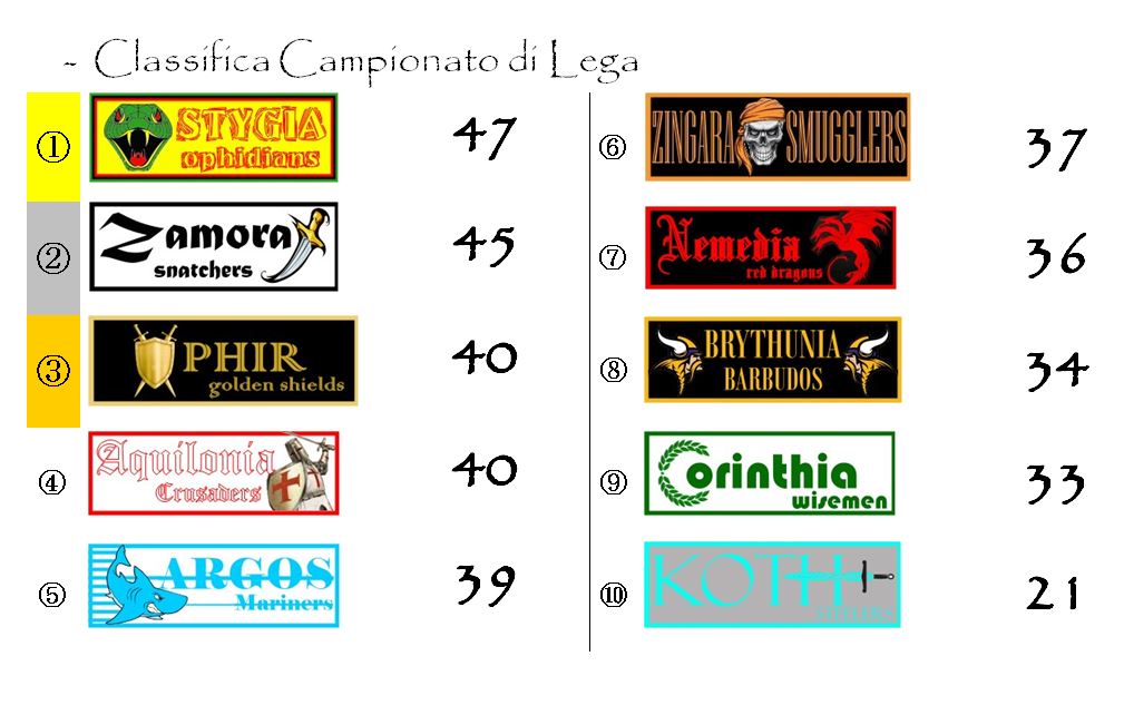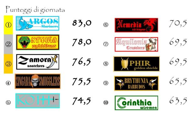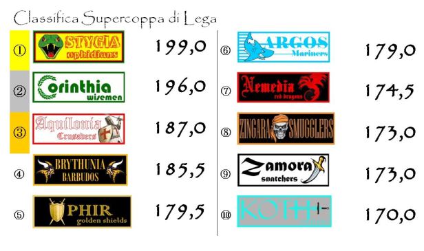 Allungo degli Ophidians anche in Supercoppa. I punti che ora dividono Stygia da Corinthia sono tre. Continuano a marcarsi ad uomo Aquilonia e Brythunia, in lotta per il terzo gradino del podio, mentre nelle retrovie è Nemedia ad aver guadagnato una posizione ai danni degli Zingara Smugglers.