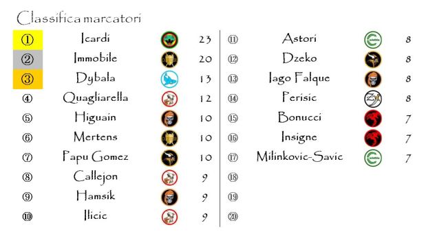 E visto che non c’è tre senza quattro, stygiano è anche il protagonista della classifica dei goleador. Con la doppietta di sabato è salito infatti a quota 23 reti Mauro Icardi. L’argentino è riuscito ad incrementare il proprio vantaggio sul rivale Ciro Immobile, anch’esso autore di una doppietta troncata però della pessima prestazione degli Ophir Golden Shields (e non è la prima volta in questa stagione). Alle spalle dei battistrada continua il duello per la terza piazza: sia Dybala che Quagliarella sono infatti andati a segno durante questa giornata. Hanno mosso la classifica anche Iago Falque, Perisic e Bonucci.