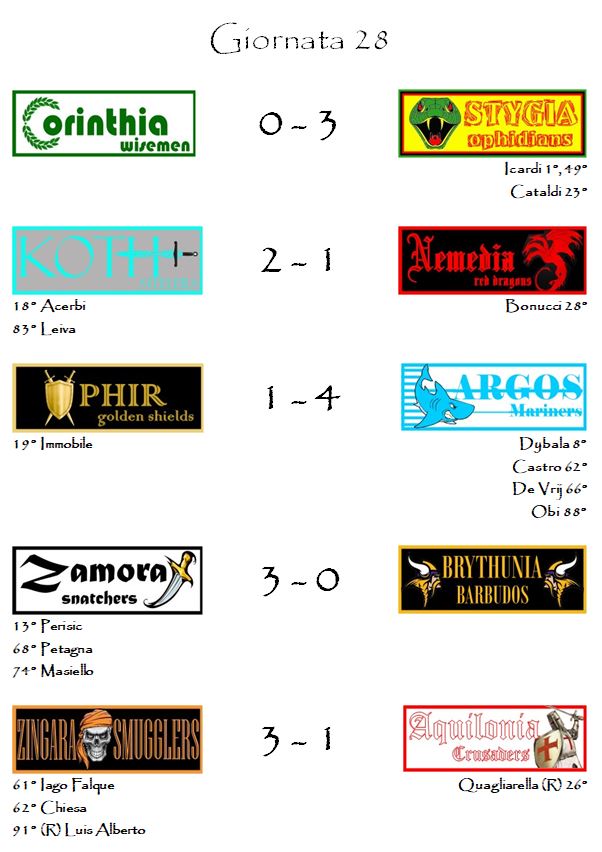 Stygia ha espugnato senza troppe difficoltà il campo dei Corinthia Wisemen che stanno ormai colando a picco in Campionato. Doppietta di Icardi e gioiello su punizione di Cataldi per un successo senza appello. Inoffensiva la franchigia dei saggi che non è andata oltre i 63,5 punti nonostante la contemporanea presenza in campo di ben quattro giocatori offensivi.