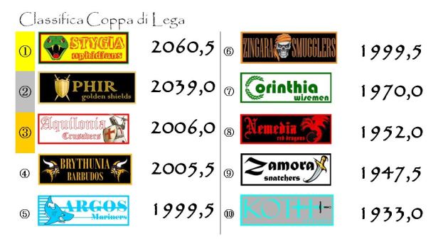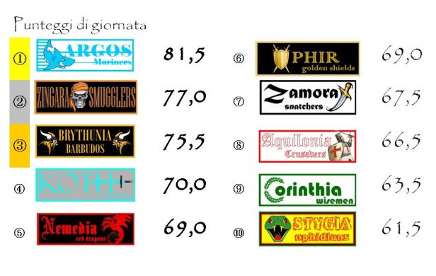 La buona prestazione di giornata ha consentito agli Argos Mariners di guadagnare una posizione in Coppa, appaiando al quinto posto gli Zingara Smugglers. La lotta per il gradino più basso del podio è ora ancora più serrata con ben quattro franchigie racchiuse in soli sei punti e mezzo. In vetta ha preso una boccata d’ossigeno Ophir che ha recuperato 8,5 punti alla Stygia portandosi a poco più di trenta lunghezze dalla capolista.