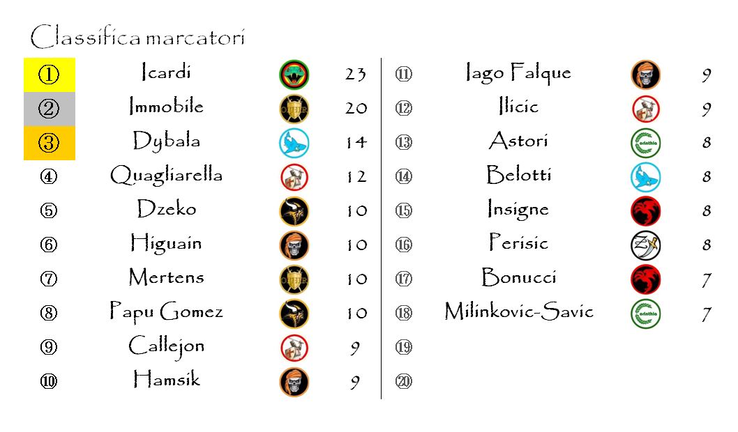 Nulla si muove nelle prime due posizioni della classifica dei marcatori. Icardi aveva una ghiotta opportunità di allungare ma non l’ha sfruttata. Dybala è salito a quota 14 consolidando la sua terza posizione mentre Dzeko si è inserito nella colonna di sinistra grazie alla doppietta, comunque inutile, realizzata contro Argos. Si rivede finalmente nella top 20 il Gallo Belotti che ha scalato molte posizioni.